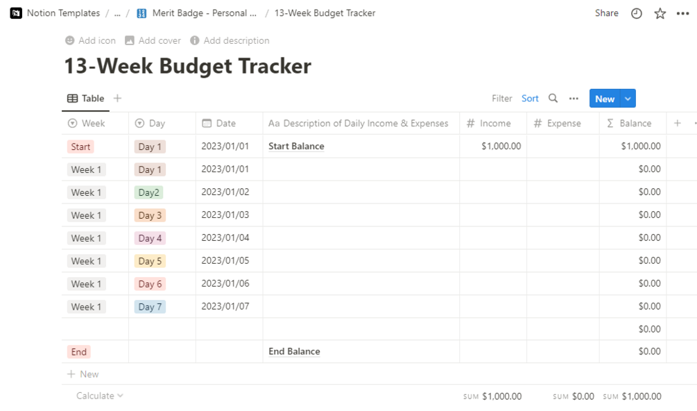 Notion template for Personal Management merit badge, requirement 2(c) 13-Week Budget
